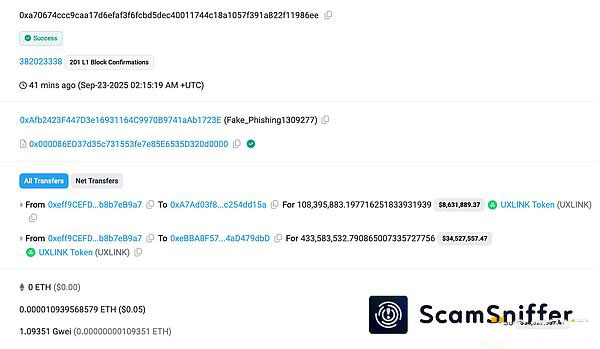 但黑客疑似遭遇了黑吃黑。据Scam Sniffer监测,UXLINK被利用的地址疑似向一个钓鱼合约签署了恶意的increaseAllowance授权,导致约5.42亿枚UXLINK被转入钓鱼地址。