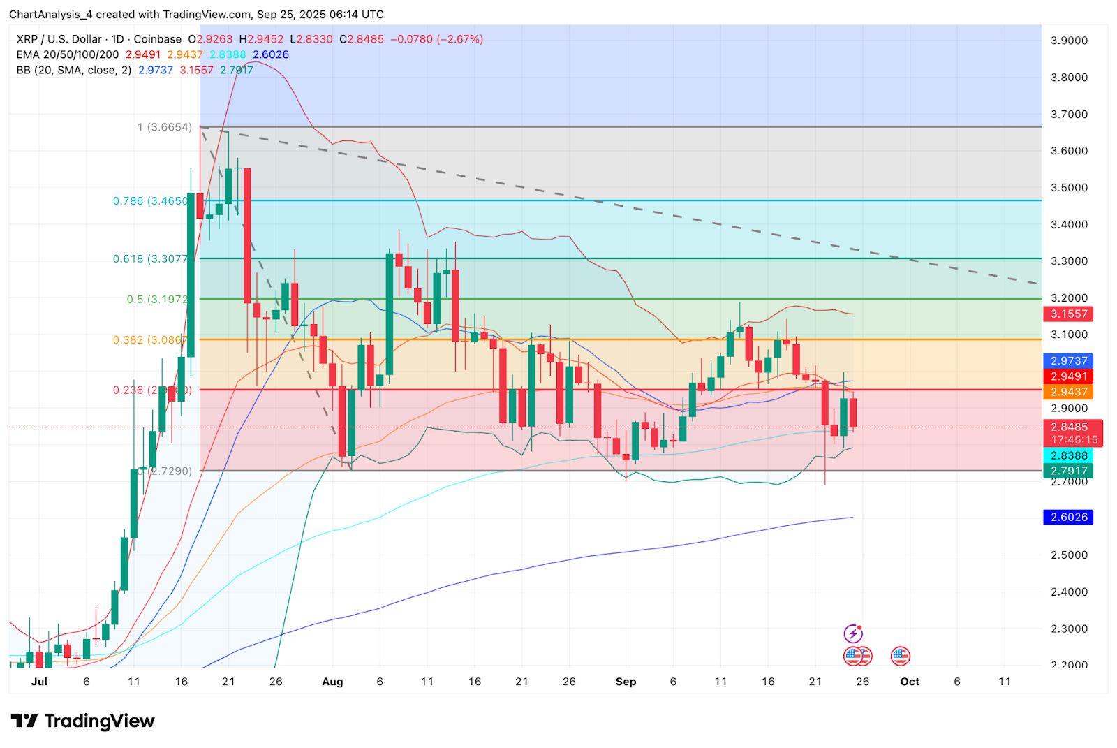 - 在 2.94 美元至 2.95 美元 EMA 集群受到拒绝后,今天的 XRP 价格交易价格接近 2.84 美元。