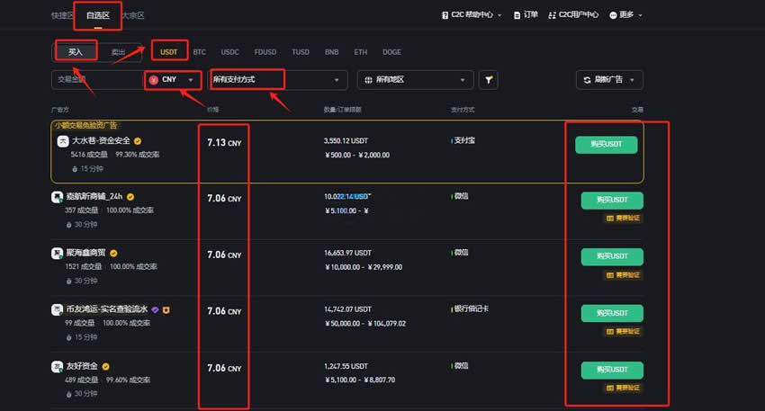 6、在进行现货交易前需要获得USDT,可在“一键买币”——“自选区”——“买入”获得,注意法币需要选择CNY,然后根据需求选择交易商家