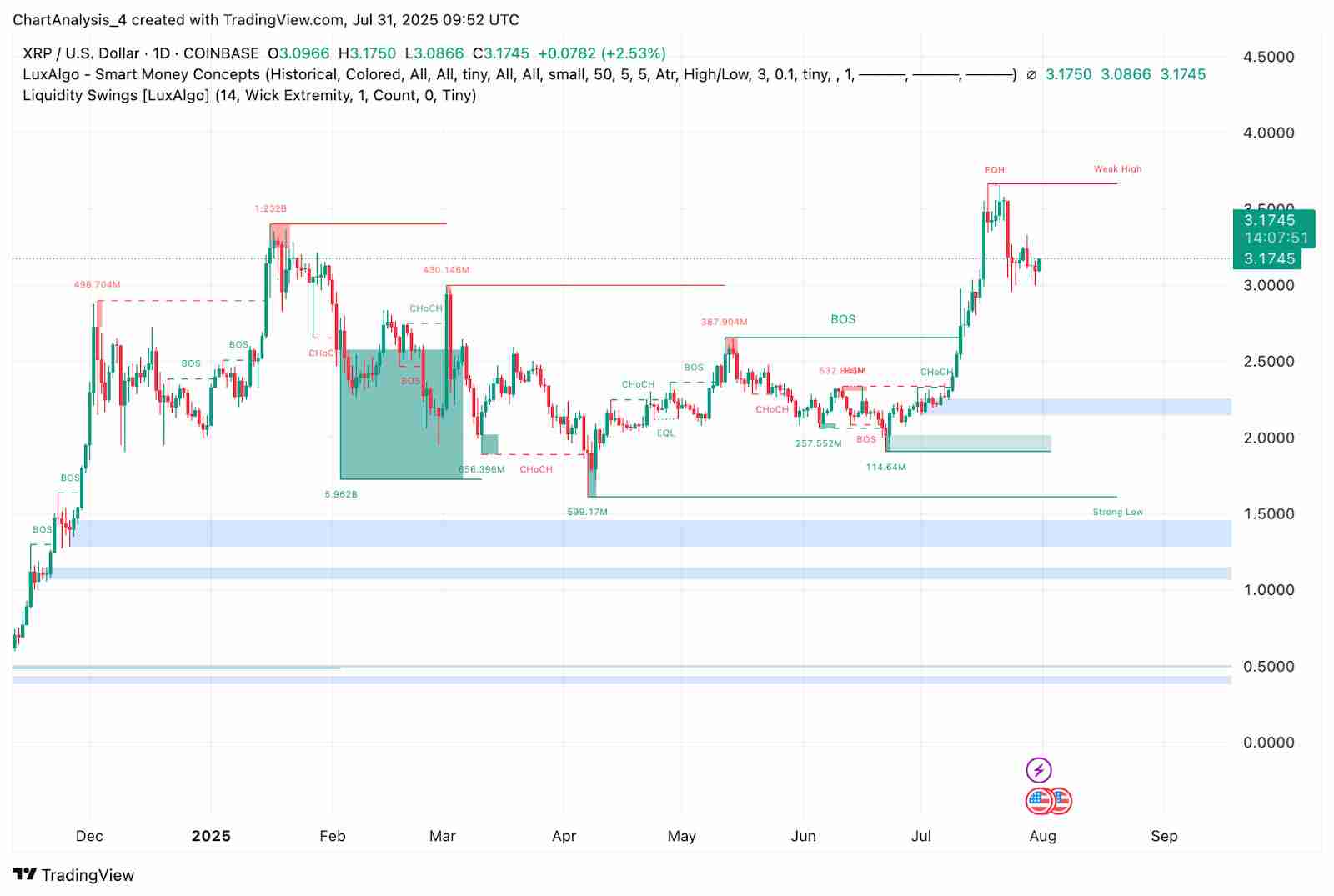 从周线级别看,XRP 成功突破了长期形成的对称三角形形态,强势上穿 3.00 美元,并短暂冲击 3.40 美元后回踩。此次突破得到了 OBV 指标走高以及 Smart Money Concepts 中清晰的看涨结构支撑,多个结构突破点(BOS)确认了趋势的延续性。目前价格稳定在 0.786 斐波那契回撤位 3.08 美元之上,显示多头仍掌控局面。