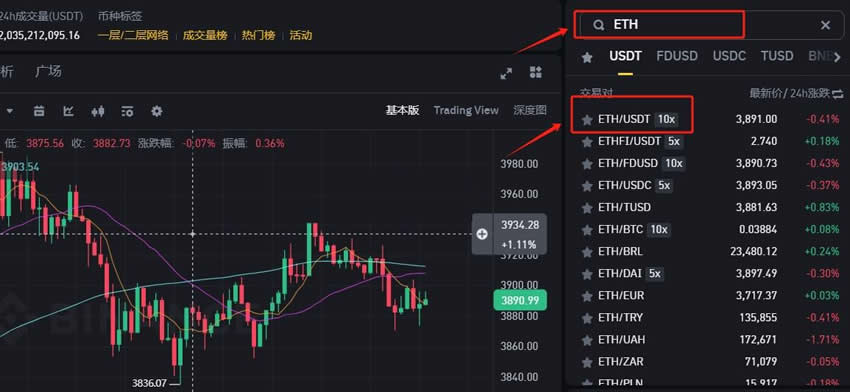 8、搜索币种简称【ETH】,选择【ETH/USDT】交易对